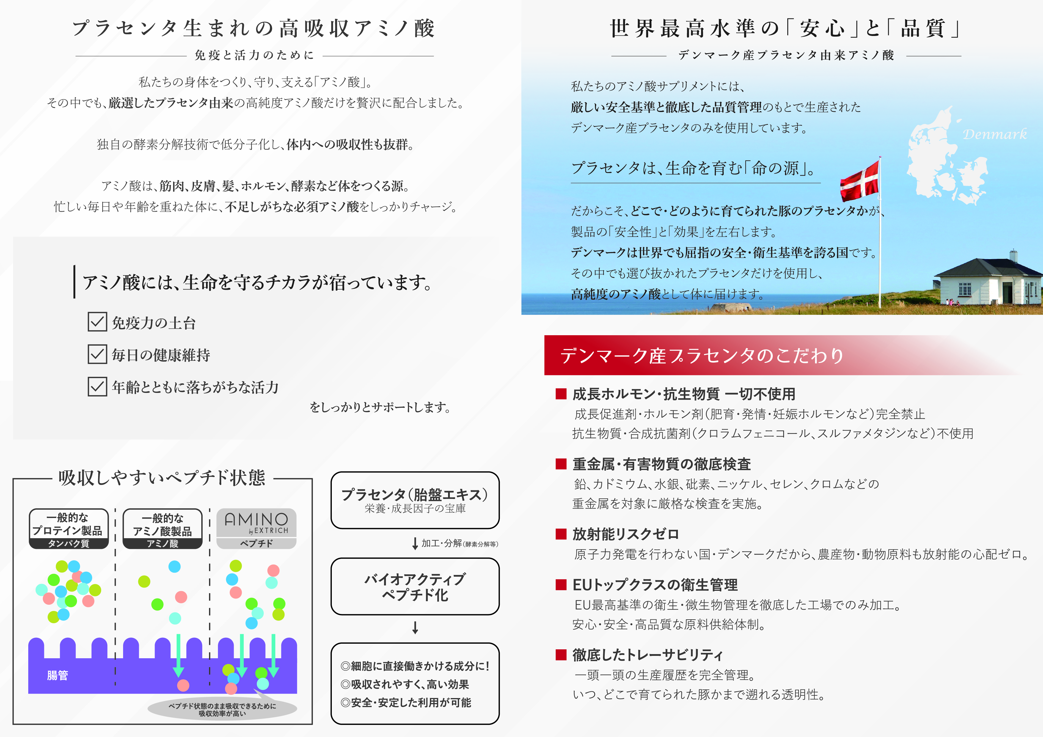 「AMINO by EXTRICH」は世界最高水準の「安心」と「品質」を誇る、デンマーク産プラセンタ由来のアミノ酸です。